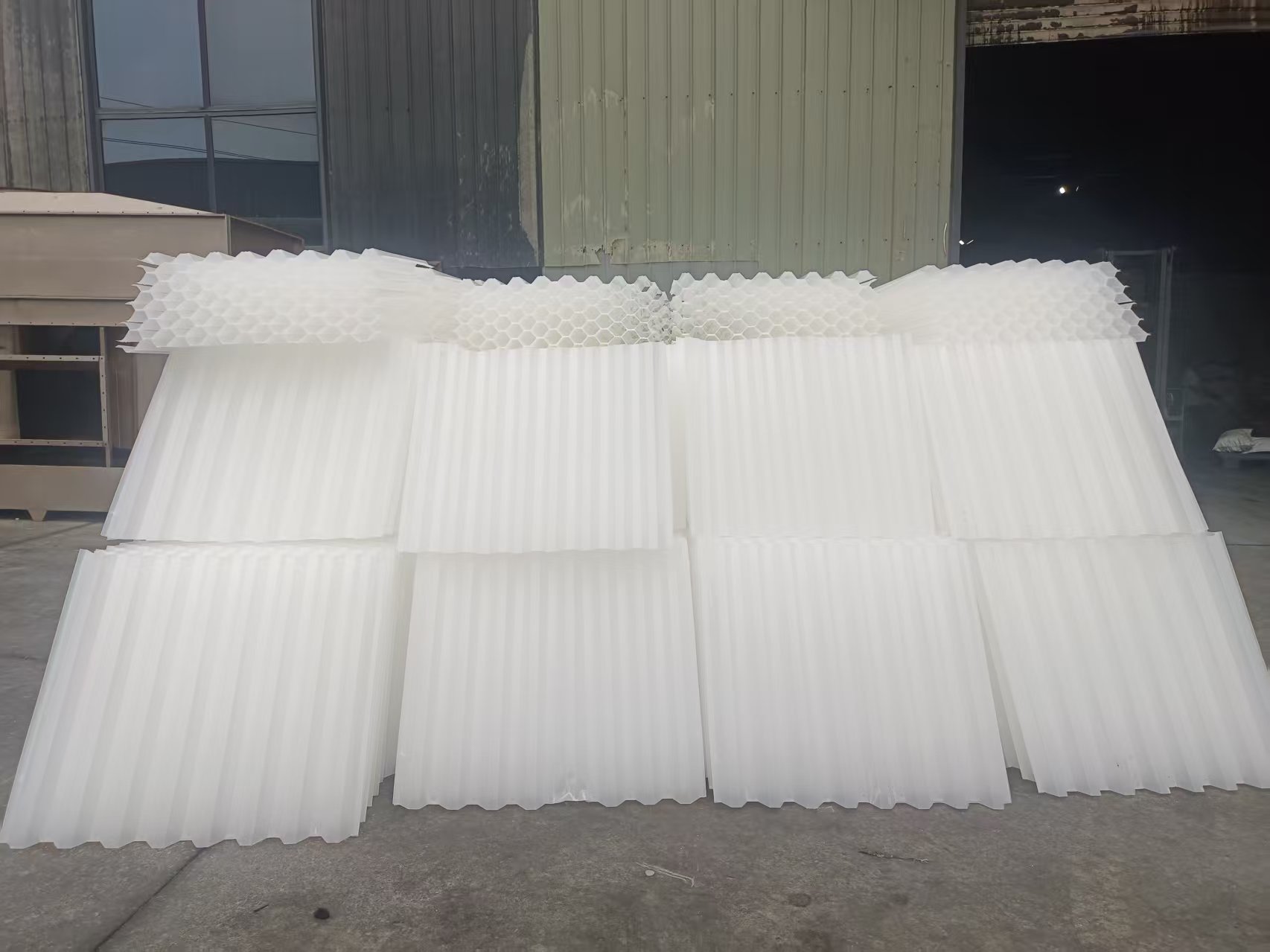 按填料燙接方式將每一個(gè)斜管填料包裝作為一個(gè)單獨(dú)的燙接單位,一個(gè)單位完成燙接后為1㎡,燙接完成后在場(chǎng)地上整齊堆放;