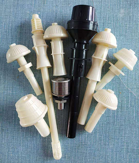 濾頭、濾帽、排水帽、濾水帽材質分;ABS濾頭(工程塑料)、PP濾頭(聚丙烯)、不銹鋼濾頭(材質分為304、316L)。外觀形狀分;梅花型、圓柱型疊片式、塔型、蘑菇型、傘形等等。柄長度分;長柄濾頭、中柄濾頭、短柄濾頭。 承壓強度高, 踩碰不碎,在濾頭結構中強化螺紋,增設橡膠墊圈,聯接牢固,永不脫落。濾頭底座設計增強底縫,使與濾板間無死水區,不積泥等優點廣泛應用于各種濾池、機械過濾器、離子交換器等各種凈化水過濾裝置,濾速穩定使用壽命長等優點
