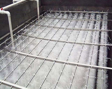 立體彈性填料篩選了聚烯烴類和聚酰胺中的幾種耐腐、耐溫、耐老化的優質品種,混合以親水、吸附、抗熱氧等助劑,采用特殊的拉絲,絲條制毛工藝,將絲條穿插固著在耐腐、高強度的中心繩上,由于選材和工藝配方精良,剛柔適度,使絲條呈立體均勻排列輻射狀態,制成了懸掛式立體彈性填料的單體,填料在有效區域內能立體全方位均勻舒展滿布,使氣、水、生物膜得到充分混滲接觸交換,生物膜不僅能均勻的著床在每一根絲條上,保持良好的活性和空隙可變性,而且能在運行過程中獲得愈來愈大的比表面積,又能進行良好的新陳代謝。